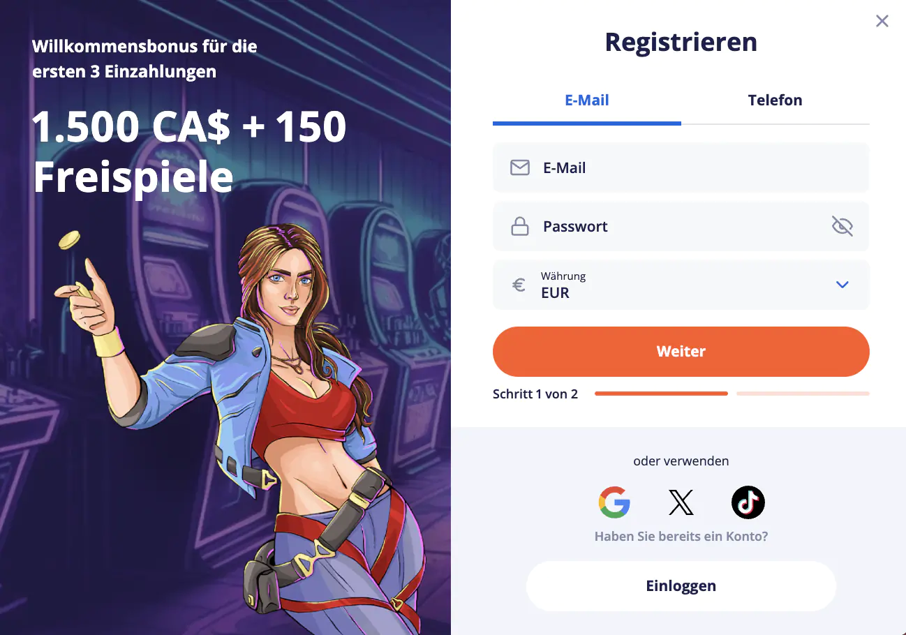 - Daten eingeben: Tragen Sie eine gültige E‑Mail‑Adresse, Passwort und bevorzugte Währung ein.
